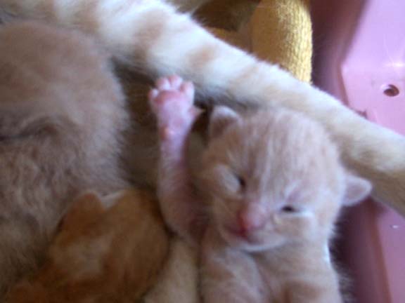 Since around day 9 or 10, they've slowly started opening their eyes. They're also getting friskier and more kittenlike. I have no way of capturing it on film, but Guinness is starting to develop that whole sensual cat thing. She's the only one I've caught doing the kitty kneading thing while nursing, and once again, while my friend Leisa was over, she started purring during her dinner, too. (No, not Leisa, the kitten, Guinness. Follow me here.) And, yes, once again, we did the girly thing. "oooooh! teehee teehee!" Ick. Guinness also loves being scratched on the belly and behind the ears (she's such a girl), while the boys are still rather insecure about the whole thing.